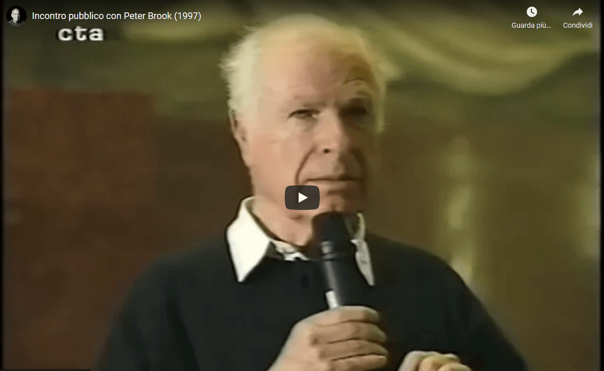 Incontro Pubblico con Peter Brook, 26 febbraio 1997 https://www.youtube.com/watch?v=-F-FfTQ_AgE&embeds_referring_euri=https%3A%2F%2Ftaliatitu.it%2F&source_ve_path=MjM4NTE